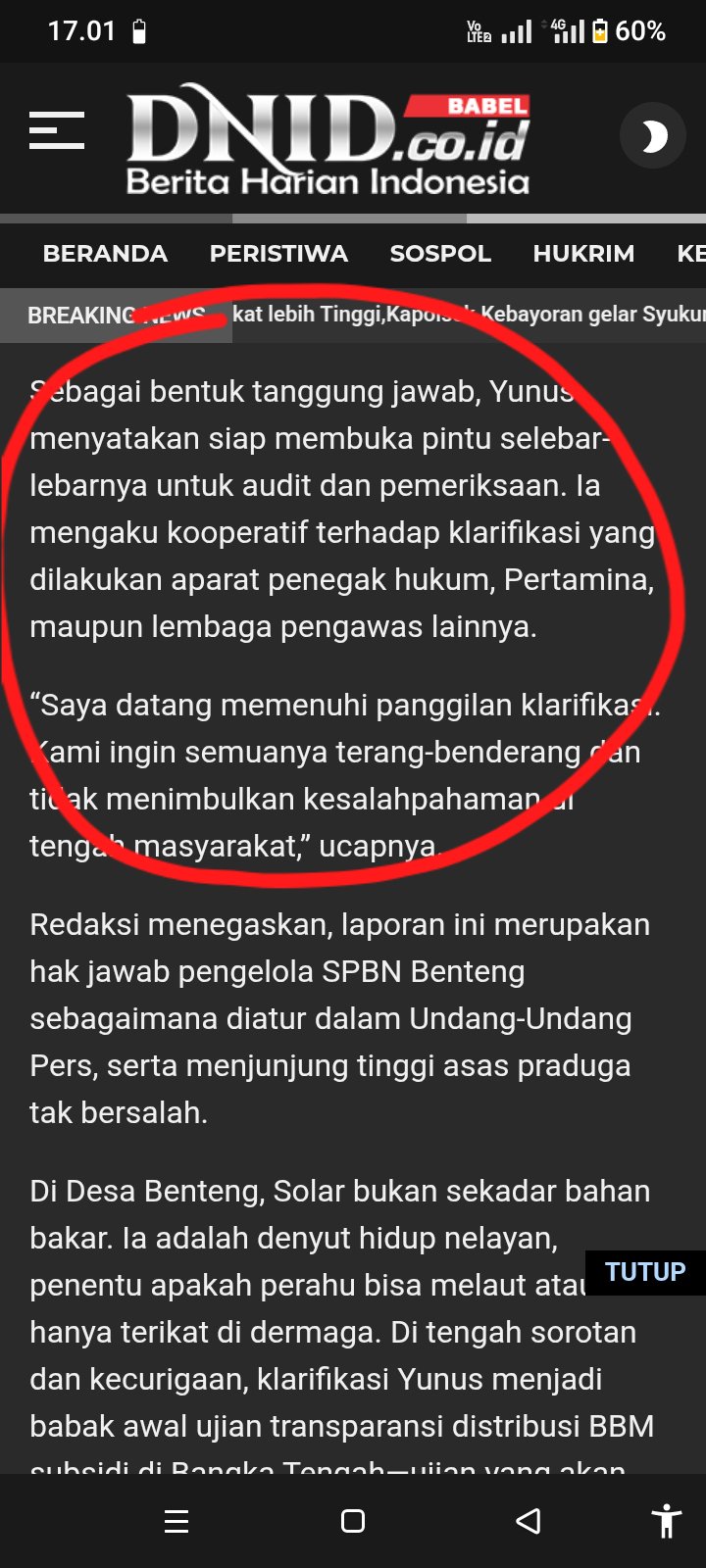 Bangka Tengah —Polemik dugaan penyalahgunaan distribusi BBM bersubsidi di SPBN Benteng memasuki babak baru. Setelah menjadi sorotan publik dan pemberitaan media, Yunus selaku pengelola SPBN akhirnya angkat bicara melalui media lain. Senin (6/1/2026).